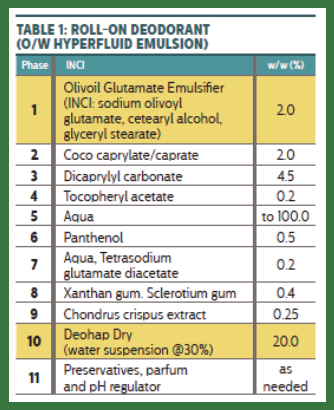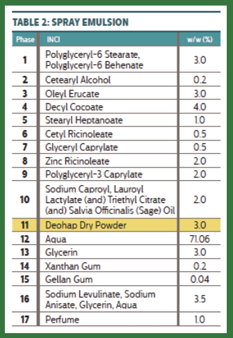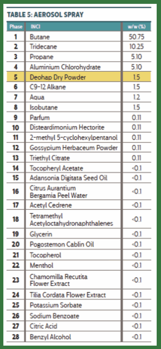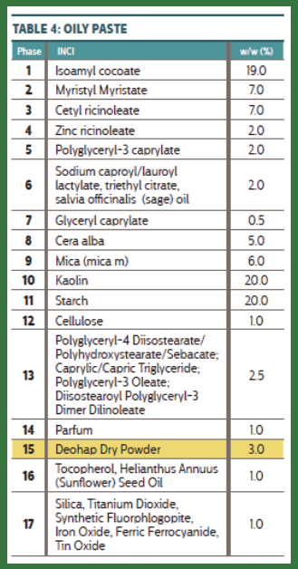 Each formulation (see Tables 1–5 in the study) demonstrates excellent stability, sensorial performance, and odour reduction, confirming Deohap Dry’s adaptability for both water-based and anhydrous systems.