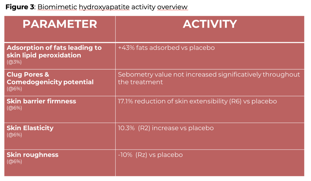 - Hydroxyapatite: apart from its known delivery system action, hydroxyapatite is a mineral with a strong adsorbing action on skin lipids, in particular fatty acids and, to a lesser extent, triglycerides. The adsorbent action has a strategic role in the prevention of lipid peroxidation of skin fats exposed to oxidant stress factors (mainly ozone and UV rays) through the adsorption of these fat components, which would otherwise act as a substrate for the formation of ROS, and therefore the formation of free radicals at the epidermal level. Hydroxyapatite also has known anti-bacterial and adsorbent properties on various pathogenic bacterial and viral species, thus representing a potentially strategic component for preserving the balance of the skin microbiota and for contributing to the prevention of colonization of pathogenic species at the stratum corneum level, especially after exposure to pollutants. Last but not least cosmetics treatment with biomimetic HAP highlighted an increase of the skin elasticity and firmness, as well as wrinkle depth reduction.