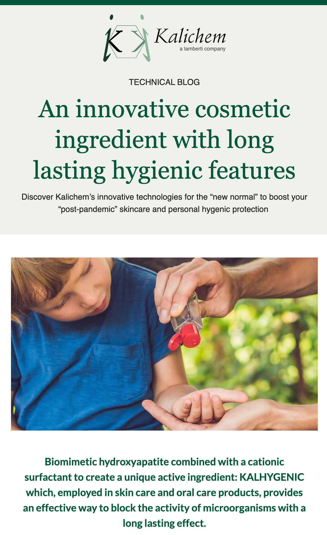 L’idrossiapatite biomimetica combinata con un tensioattivo cationico crea un nuovo ed univo ingrediente: KALHYGIENIC che, impiegato in prodotti skin care e oral care, fornisce un efficace e duraturo blocco delle attività di microorganismi esterni.